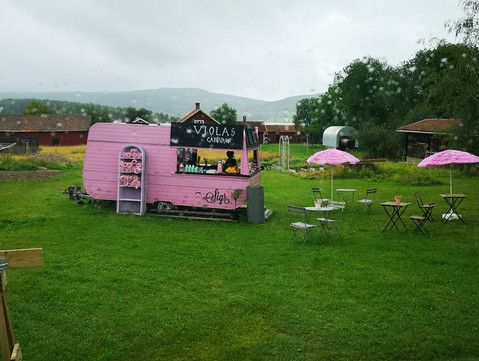 Unterwegs machen wir einen kurzen Kaffee-Stopp an einem der skurrilsten Kaffee-Stände, den wir bisher gesehen haben. Viola's Cafévagn ist ein umfunktionierter alter Wohnwagen, ganz in pink und mit meiner rosa Regenjacke passe ich doch ganz hübsch dazu. Bedient werden wir von einem kleinen Jungen, der professionell das Familienunternehmen in den Sommerferien leitet. Dazu bestellen wir überzuckerten Schoko- und Apfelkuchen (Die Schweden scheinen ihr Süssgebäck zu lieben und haben das Backen echt im Griff), den wir unter einem pinken Sonnenschirm an einem kleinen Tischli verschlingen. Definitiv einen Zwischenstopp wert!