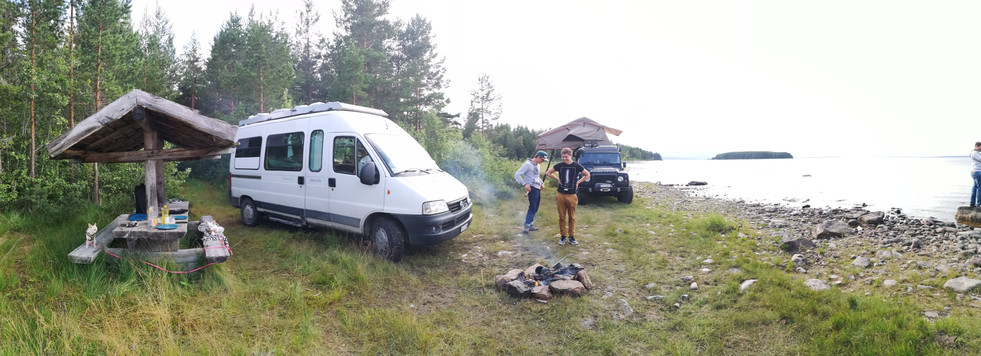 Der Rückweg zieht sich dann doch noch ziemlich und wir sind froh, uns beim Paddeln abwechseln zu können. Ich glaube Nico und Simi bereuen mittlerweilen ein klein wenig, jeweils ein Einzelkayak genommen zu haben. Schliesslich schaffen wir es ohne grössere Zwischenfälle (Ok, Simi ist beim Einstieg kurz ins Wasser gefallen, aber immerhin keine Verletzungen!) zurück an unseren Steg. Definitiv unsere beste Böötlierfahrung bisher und trotz meinem gebrochenen Versprechen habe ich kein schlechtes Gewissen mehr, denn beide Hunde haben den Ausflug sichtlich genossen! Erschöpft schleppen wir die Kayaks ans Ufer und warten auf Erik. Als dieser unseren Hektor und den Defi sieht ist er hin und weg und möchte alles sehen und alles wissen über unsere Fahrzeuge. Besonders Hektor scheint es ihm angetan zu haben, er knippst gefühlt 1000 Fotos von jeder noch so kleinen Ecke und Kevin muss ihn davon abhalten, auch noch unser Klo zu öffnen und davon ein Bild zu schiessen. Er fragt uns tausend Fragen und ist total begeistert von unserer Reise und wir merken ihm an, auch für ihn wäre dies ein Traum. Natürlich quetschen auch wir ihn ein wenig aus, wo man am besten Elche sehen kann. Er gibt uns ein paar Tipps und erzählt uns von einem kleinen Fluss in der Nähe, wo man unter Garantie Biber sehen kann! Natürlich müssen wir dahin, für heute ist es jedoch schon zu spät.