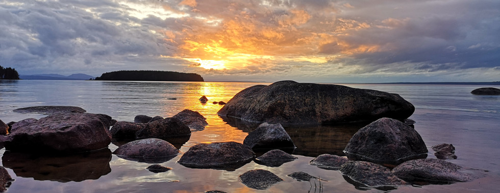 Die Art, wie die Knochen im Gelände verteilt und abgenagt sind lassen bloss auf Wildtiere wie Wölfe oder Bären schliessen, welche anderen Tiere könnten sonst so einen riesigen Elch erlegen? Jäger hätten doch bestimmt zumindest den Schädel als Trophäe behalten? Jedenfalls habe ich für heute genug vom Spaziergang im Wald des Grauens, denn so sehr ich alle Tiere liebe, ich möchte weder Wölfen noch Bären in ihrem Territorium begegnen. Am Strand geht sowiso schon bald die Sonne unter. Wir braten in unserer Slowakischen Speckzange für alle ein Spiegelei auf Toast und beobachten schliesslich, wie die Sonne im Meer versinkt. Ich glaube ich spreche für alle Mitreisenden, wenn ich hier schreibe, dass dies der spektakulärste Sonnenuntergang unserer gesamten Nordeuropa-Reise war.
