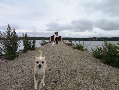 Eigentlich ist man nicht richtig in Schweden gewesen wenn man nicht in einem Kayak gesessen hat. Nun haben wir ja bisher nicht wirklich die besten Erfahrungen mit Bootsausflügen gemacht und als wir in Leksand das wacklige Zweierkayak besteigen packt mich das schlechte Gewissen... Hatte ich nicht Milo und Chewie nach unserem beinahe-Boots-Unglück auf dem Walensee versprochen, sie müssten nie wieder ein Boot besteigen? Zählt ein Kayak überhaupt als Boot? Bin ich ein Raben-Frauchen? Diese und weitere Fragen schwirren mir im Kopf herum und noch bevor ich den Gedankengang beenden kann, sitzt Chewie im Kayak und schaut mich aus grossen Augen unter seiner Schwimmweste an. Für mich ein Zeichen, dass er doch mit will. Das Wetter lässt Böses erahnen, graue und schwarze Wolken hängen am Himmel über dem Fluss und Milo ist nicht sicher ob er wirklich mit will. Nervös paddeln wir los und es dauert keine 10 Minuten, haben wir unser Tempo gefunden und Milo und Chewie haben sich bereits auf unserem Schoss eingekuschelt und fühlen sich sichtlich wohl. Erik, der zuvorkommende Schwede vom Kayakverleih, schiesst noch ein Bild von uns und unseren Hunden, viele verrückte Hundehalter wie uns hat er wohl noch nicht gesehen.