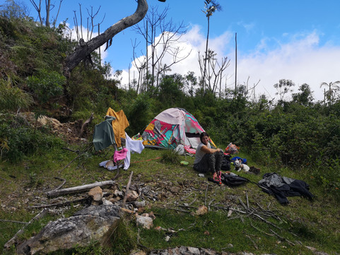 Das Wetter zeigt sich am nächsten Morgen von seiner besten Seite und wir können schöne Fotos vom Panorama und der Karibikküste machen. Auch verstehen wir langsam das Wetter, welches sich gegen den Nachmittag generell verschlechtert. In der jetzigen Regenzeit scheint dies normal zu sein. Nach dem Zmorgen bei der Herberge versuchen wir nun den Gipfel zu erreichen und das Zelt aufzustellen, bevor der Regen einsetzt. Wir wandern weiter in die Höhe wo sich die Fauna merklich verändert. Als wir schliesslich unseren heutigen Zeltplatz erreichen scheint wunderbar die Sonne, wir können unser Zelt super aufstellen und sogar noch die nassen Sachen vom Vortag trocknen!! Unser Zelt steht leider nicht direkt auf dem Gipfel, da sich eine Militärstation am obersten Punkt des Cerro Kennedy befindet. Leider lässt das Wetter auch diesen Nachmittag keine weite Sicht zu, wenigstens kann Milo den schon lange entbehrten Rasen geniessen! Später am Nachmittag setzt auch tatsächlich der Regen wieder ein und wir müssen uns bis zum nächsten Morgen in unser Zelt zurückziehen.
