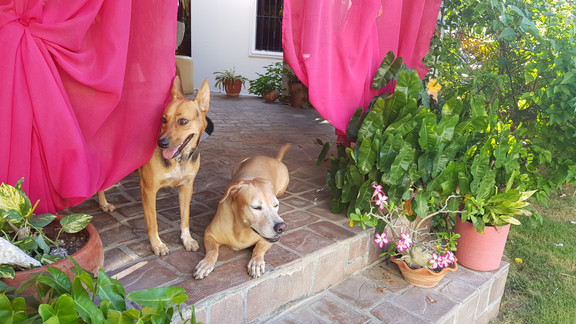 Mit der Sonne erwachen auch wir, die Hitze ist für uns kaum aushaltbar. Im Hellen können wir nun endlich unser B’n’B, das sich im riesigen tropischen Garten einer Villa befindet, genauer betrachten. Es gibt einen Pool, der zum Glück nicht beheizt ist, ganz für uns alleine. Rund um uns wachsen tropische Bäume, Büsche und Blumen, Frangipani und Bananenstauden. Geckos tümmeln sich in den Blättern der Palmen und wir sind überwältigt vom Tropen-Feeling. So haben wir uns das vorgestellt! Die Besitzerin des Grundstücks hat ebenfalls drei Hunde, die sich sofort mit Milo und Chewie anfreunden und auch wir haben die drei schnell ins Herz geschlossen. Unsere Klima-Anlage können wir nun gegen Aufpreis auch bedienen.