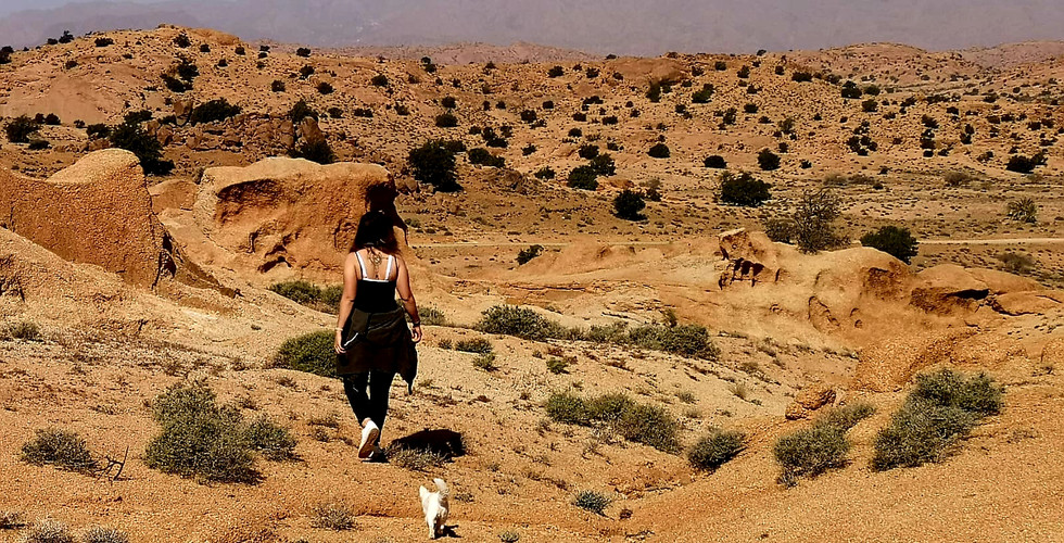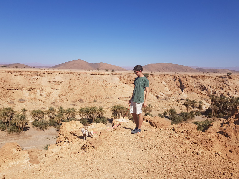 Am nächsten Tag fahren wir kurz vor Mittag los Richtung Tissint, wo wir tatsächlich den örtlichen Gemüseladen finden und uns gleich für längere Zeit eindecken. Was wir bisher gelernt haben ist, dass man hier in Marokko jede Gelegenheit nutzen muss, sei dies beim Auffüllen von Frischwasser, Wäsche machen oder eben Lebensmittelkauf. Die Wasserfälle, die hier sein sollen finden wir leider nicht, kommen aber auf dem anschliessenden Weg an einigen kleinen Oasen vorbei, wo wir auch kurz Halt machen zum Spazieren und Bestaunen. Wir fahren weiter, vorbei an Ziegen und Dromedaren, Eseln und einem kleinen Sandsturm und kommen schliesslich nach Foum Zguid (oder so ähnlich) auf einem schönen Campingplatz, wo wir unter Palmen den Tag ausklingen lassen. Wir haben ein paar kleine Verbesserungs-Arbeiten zu tätigen und fragen unsere direkten Nachbarn, ob es wohl ok wäre, wenn wir eine kurze Zeit lang «Lärmen». Ob sie bei «Bien sur» wohl damit gerechnet haben, dass wir gleich unsere ziemlich laute Fein-Maschine auspacken? Naja, die Reparaturen sind jedenfalls erledigt😊 Was sie im übrigen wohl dachten, als ich unsere zwei sehr dreckigen, beinahe knallroten (vom Wüstensand eingefärbten) Chihuahuas in der Wanne vor dem Bus bade und bürste wissen wir auch nicht so genau, aber morgen ziehen wir ja schon wieder weiter.