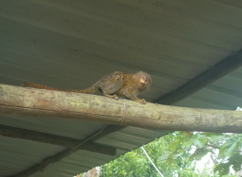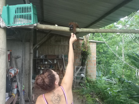 Am nächsten Tag erwachen wir wie gewohnt sehr früh (unser Tag-Nacht-Rhythmus schwingt mittlerweilen wieder mit dem Tageslicht mit), können aber noch keine Affen in den Bäumen ausmachen. Beim Warten auf unser geniales lokales Frühstück (Bananen, Mangos, Eier und Kaffee) erblicken wir dann tatsächlich die ersten Äffchen und können diese sogar mit Bananen füttern! Es gibt sie also doch und hier und sie scheinen sich an Touristen gewöhnt zu sein! Unser Essen muss noch ein bisschen warten, bis auch das letzte Äffli sein Banänli bekommen hat und zufrieden abzottelt. Wir sind im Affenfieber und wollen die herzigen Tiere (übrigens leben hier zwei Arten, die «Bebe leche» wegen dem Milchschnäuzchen und die Titi Leon, die kleinsten Äffchen der Welt!) am nächsten Tag unbedingt nochmals sehen. Den Tag verbringen wir mit Malen, Blogschreiben, Chätzlischmüselen und mit den Hunden spazieren. Die Affen tauchen ebenfalls nochmals auf, als es stark zu regnen beginnt (dann suchen sie nämlich Unterschlupf unter dem Dach der offenen Hostel-Küche). Ich kümmere mich noch um einen armen Tropf von Hund, der unter der Räude leidet. Er bekommt ein Bad, eine Entwurmungskur und ein Anti-Räudemittel (natürlich in Absprache mit einem Tierarzt, der uns hier in Mocoa noch die nötigen Papiere für Milo und Chewie’s Einreise nach Ecuador ausgestellt hat).